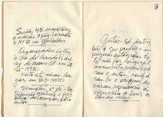 Raimundo Arruda Sobrinho escreve enquanto há luz natural, com o auxílio de uma régua de 30 cm para manter as linhas retas no papel não pautado. Monta os livros, os quais distribui para as pessoas que o ajudam, com recortes de folhas de papel sulfite. Usa uma moldura de madeira de 11 cm por 16 cm para manter o espaço das margens. Assina como "O Condicionado", um pseudônimo que usa "há muitos anos". Cada exemplar doado é numerado e datado.